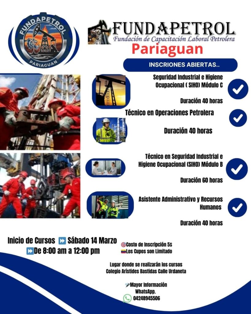 ***FUNDAPETROL abre inscripciones en Pariaguán para programas de certificación en operaciones petroleras, seguridad industrial (SIHO) y administración, orientados a profesionalizar el talento humano que impulsará la recuperación de la Faja Petrolífera del Orinoco***